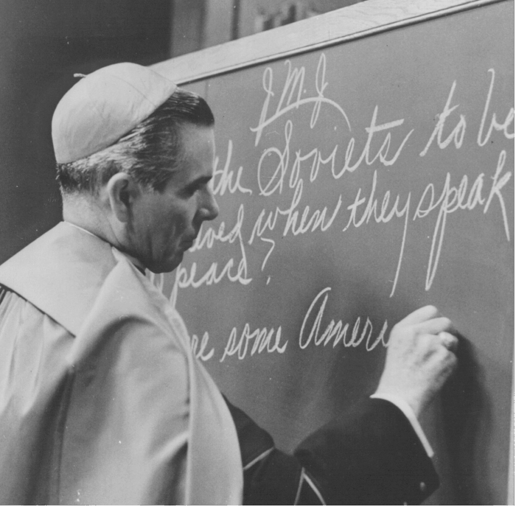 If you’re familiar with the Reverend Fulton Sheen, you’ve probably seen him write JMJ on the blackboard. That stands for Jesus, Mary and Joseph. It has become a common custom among Catholics to write this at the top of letters, documents, papers or blackboards.