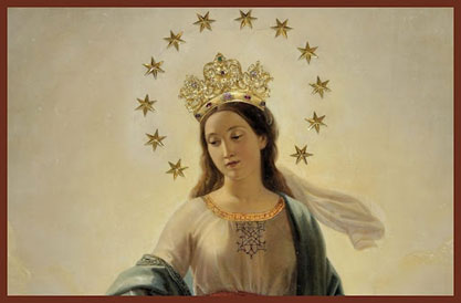 Er verscheen in de hemel een indrukwekkend teken: een vrouw, bekleed met de zon, met de maan onder haar voeten en een krans van twaalf sterren op haar hoofd. (Openbaring 12, 1)