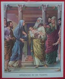 Zijn vader en moeder waren verbaasd over wat er over hem werd gezegd. Simeon zegende hen en zei tegen Maria, zijn moeder: ‘Weet wel dat velen in Israël door hem ten val zullen komen of juist zullen opstaan. Hij zal een teken zijn dat betwist wordt, en zelf zult u als door een zwaard doorstoken worden. Zo zal de gezindheid van velen aan het licht komen.’ (Lucas 2,22-35)