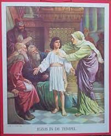 Zijn ouders gingen jaarlijks voor het pesachfeest naar Jeruzalem. Toen hij twaalf jaar was, maakten ze weer hun gebruikelijke pelgrimstocht. Na afloop van het feest vertrokken ze naar huis, maar Jezus bleef in Jeruzalem achter zonder dat zijn ouders het wisten. In de veronderstelling dat hij zich bij het reisgezelschap bevond, reisden ze een hele dag voordat ze hem overal onder hun verwanten en bekenden begonnen te zoeken. Toen ze hem niet vonden, keerden ze terug naar Jeruzalem om hem daar te zoeken. Na drie dagen vonden ze hem in de tempel, waar hij tussen de leraren zat, terwijl hij naar hen luisterde en hun vragen stelde. Allen die hem hoorden stonden versteld van zijn inzicht en zijn antwoorden. Toen zijn ouders hem zagen, waren ze ontzet, en zijn moeder zei tegen hem: ‘Kind, wat heb je ons aangedaan? Je vader en ik hebben met angst in het hart naar je gezocht.’ Maar hij zei tegen hen: ‘Waarom hebt u naar me gezocht? Wist u niet dat ik in het huis van mijn Vader moest zijn?’ Maar ze begrepen niet wat hij tegen hen zei. Hij reisde met hen terug naar Nazaret en was hun voortaan gehoorzaam. Zijn moeder sloot alles wat er met hem gebeurd was in haar hart. Jezus groeide verder op en zijn wijsheid nam nog toe. Hij kwam steeds meer in de gunst bij God en de mensen. (Lucas 2,41-52)