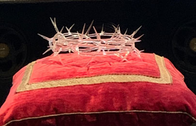 De soldaten van de prefect namen Jezus mee naar het pretorium en verzamelden de hele cohort om hem heen. Ze kleedden hem uit en deden hem een scharlakenrode mantel om, ze vlochten een kroon van doorntakken en zetten die op zijn hoofd. Ze gaven hem een rietstok in zijn rechterhand en vielen voor hem op de knieën. Spottend zeiden ze: ‘Gegroet, koning van de Joden,’ en ze spuwden op hem, pakten hem de rietstok weer af en sloegen hem tegen het hoofd. Nadat ze hem zo hadden bespot, trokken ze hem de mantel uit, deden hem zijn kleren weer aan en leidden hem weg om hem te kruisigen. (Matteüs 27,27-31).